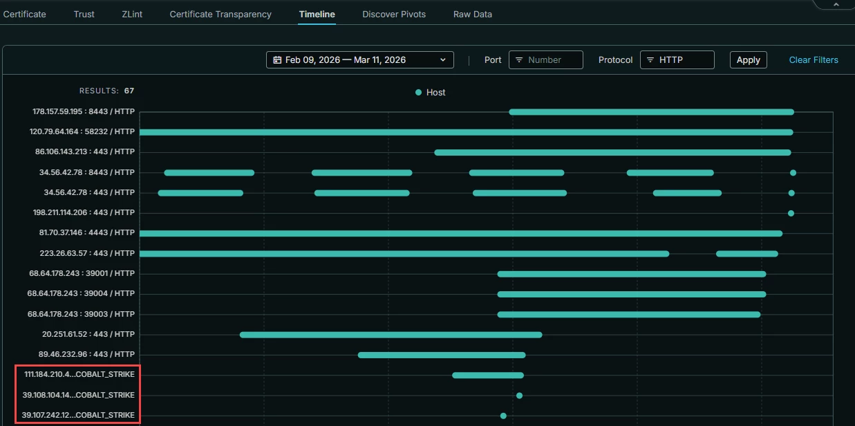 When filtering by Protocol: HTTP, entries labeled "COBALT_STRIKE" are also displayed in the results (see attached screenshot).